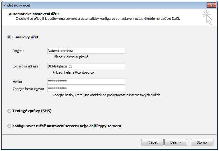 - Název účtu vyplňte libovolně (např. "Datová schránka", není použito)
