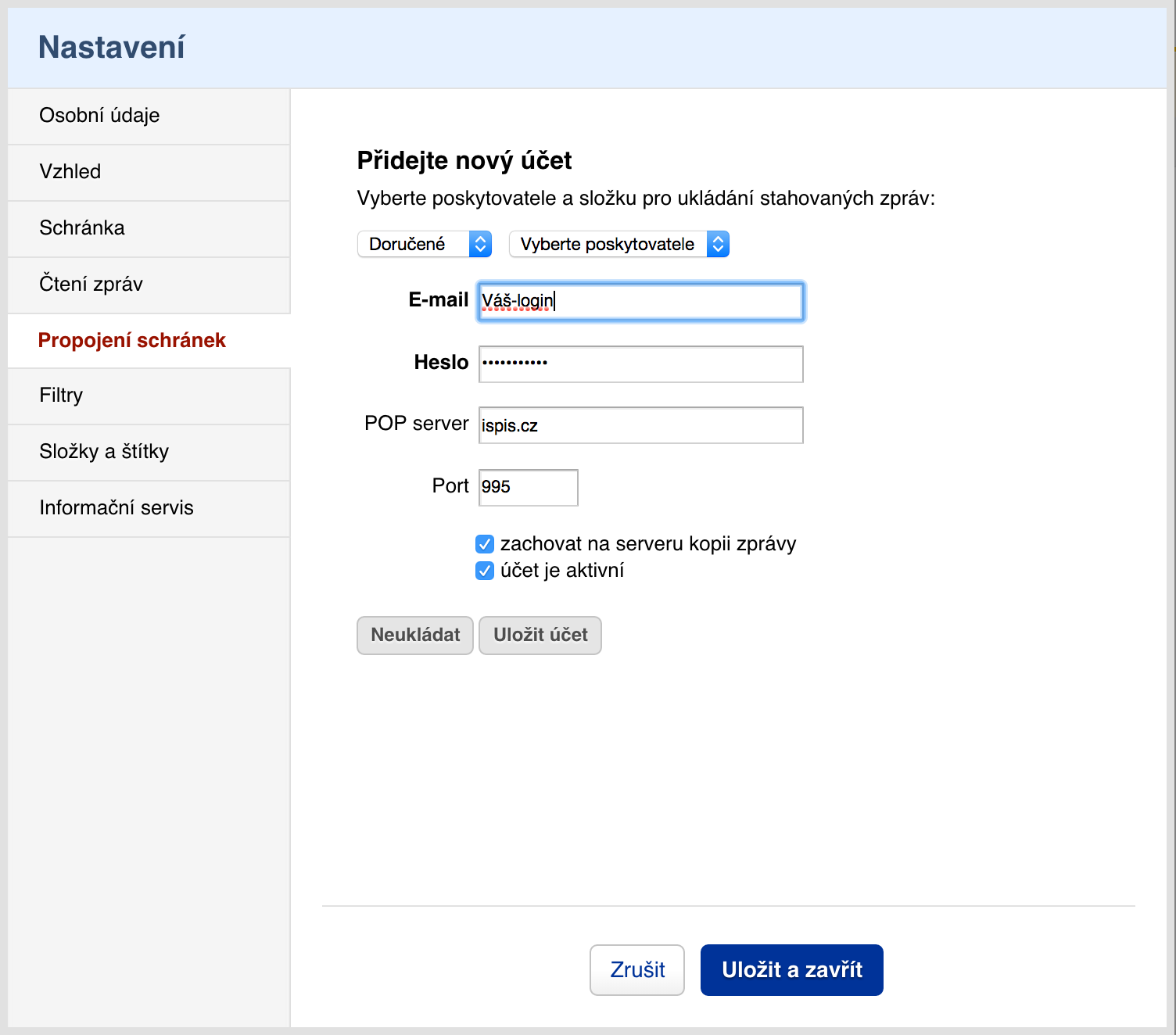 - POP server nastavte na ispis.cz, Port na 995