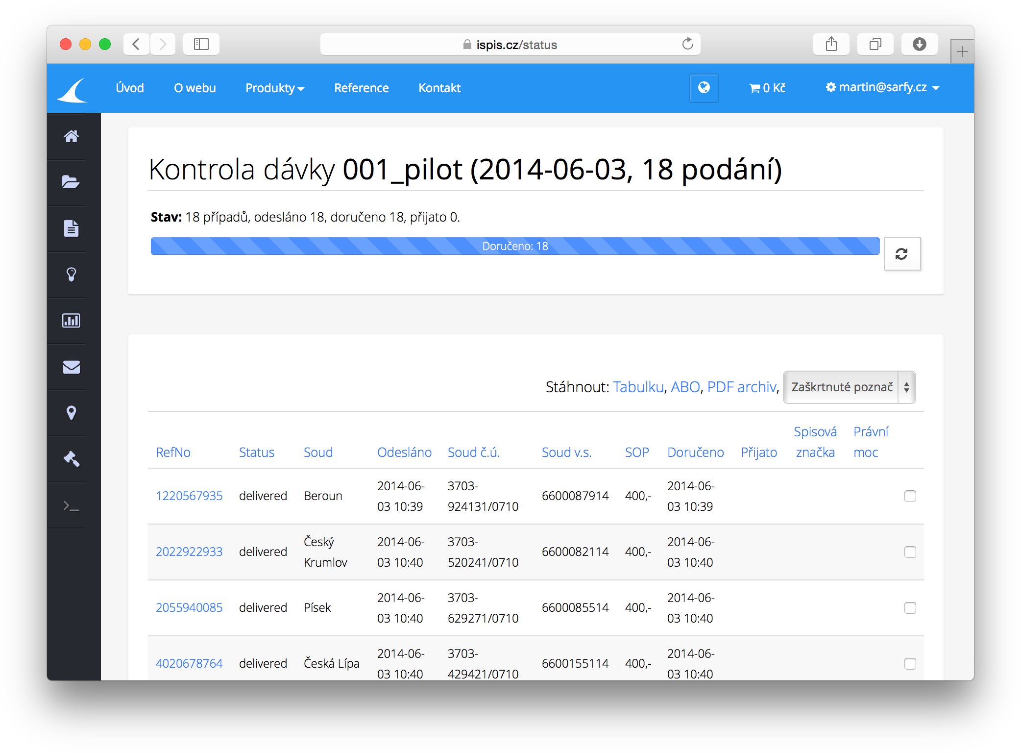 Funkce sledování stavu řízení je možné využít i pro Vaše stávající případy! Stačí do systému vložit tabulku obsahující příslušné spisové značky a systém zjistí jejich aktuální stav a dále sám hlídá stav řízení!